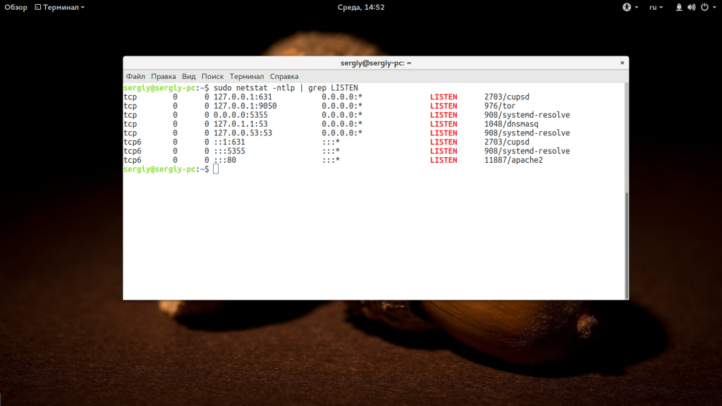 Опция -l сообщает, что нужно посмотреть прослушиваемые порты, -p показывает имя программы, -t и -u — отображают TCP и UDP порты, а -n показывает ip адреса в числовом виде. Дальше нужно выбрать только те строки, где встречается слово LISTEN, чтобы найти только прослушиваемые порты.