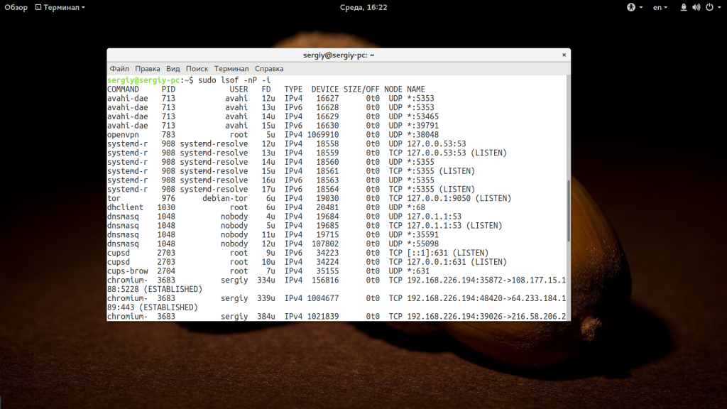 Утилита lsof тоже предназначена для просмотра открытых соединений. Основная ее функция — просмотр открытых файлов, но с её помощью можно посмотреть открытые порты Ubuntu. Используйте такие параметры: