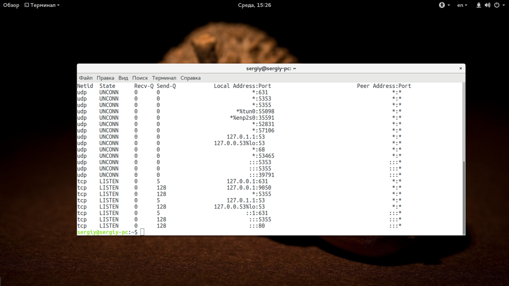 Это одна из самых старых и популярных утилит для просмотра открытых портов. Мы описывали её в отдельной статье, а сейчас просто кратко рассмотрим, как с ней работать. Чтобы посмотреть открытые порты, выполните такую команду: