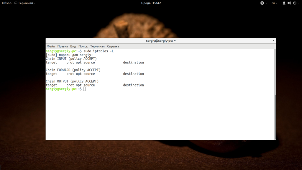 В нашем примере нет никаких ограничений. Политика по умолчанию — ACCEPT. На промышленных серверах может применяться политика DENY, а нужные порты будут разрешены с помощью правил.
