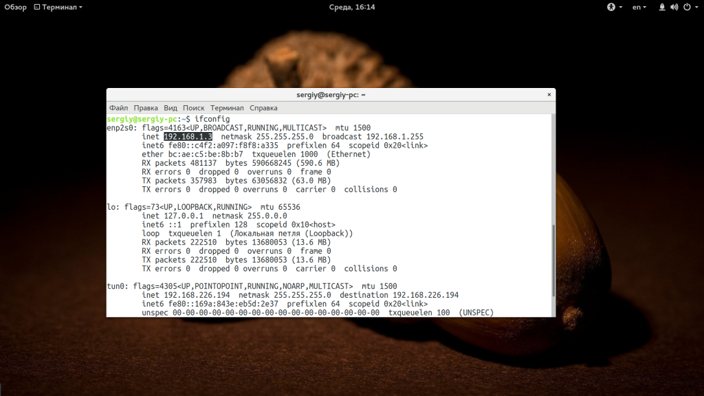 Сетевой сканер nmap позволяет проверить список портов Ubuntu так, как бы это делал злоумышленник при попытке атаки на вашу систему. Здесь вы будете видеть все порты, которые видны снаружи. Но для сканирования нужно использовать внешний ip-адрес. Не сетевой ip-адрес провайдера, а адрес вашего компьютера, например, в локальной сети чаще всего используется 192.168.1.2. Посмотреть ip вашего сетевого интерфейса можно с помощью команды ifconfig: