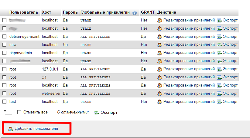GRANT ALL PRIVILEGES ON *.* TO 'Новый пользователь'@'localhost';