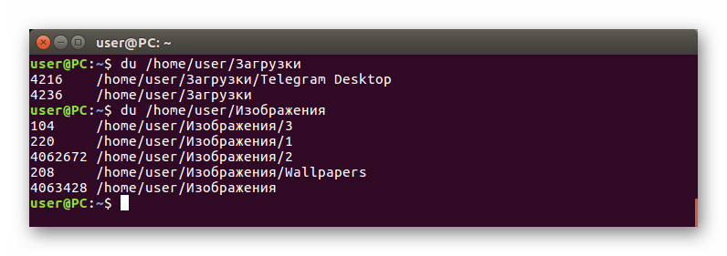 Без ввода дополнительных опций утилита будет автоматически выводить имена и размер папок, расположенных по указанному пути, попутно выводя также и подпапки.
